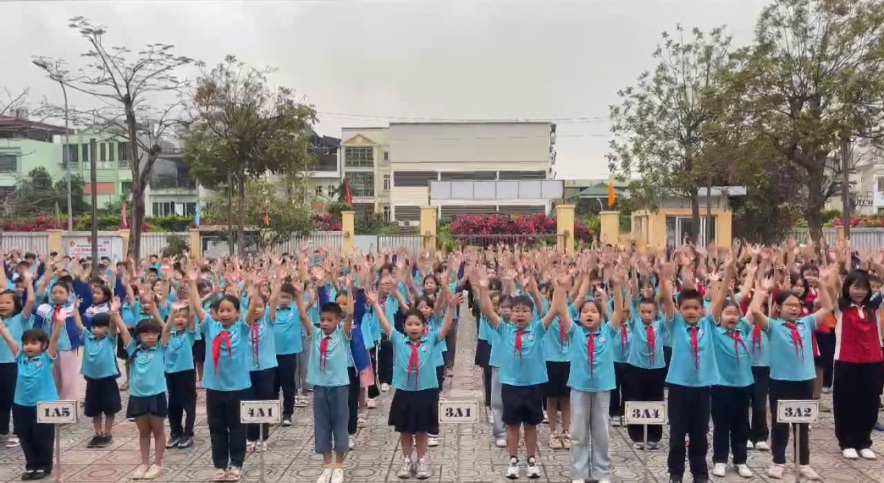 phục trường trang nghiêm, hàng trăm em học sinh đã cùng nhau giơ cao tay, đồng